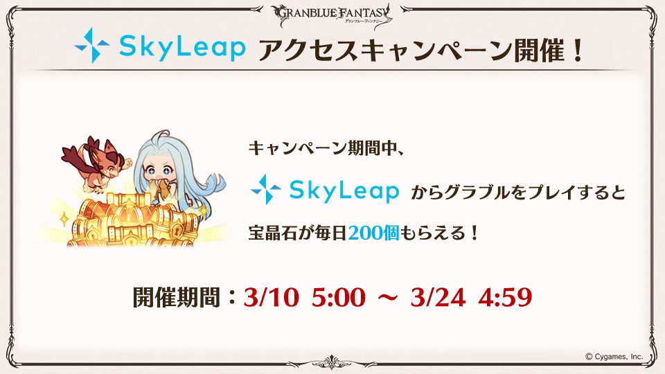 นอกจากรับเพชร 200 รายวันจากกิจกรรมหลักแล้ว ผู้เล่นที่ล็อกอินผ่านแอป SkyLeap จะได้รับเพชรเพิ่มอีกวันละ 200 ถึงวันที่ 24 มีนาคม (2:59)