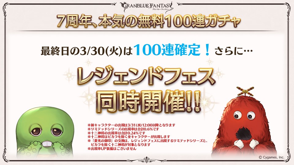 การันตี 100 โรลวันที่ 20 มีนาคม ตรงกับช่วงตู้พิเศษกลางเดือน การันตี 100 โรลวันที่ 30 มีนาคม ตรงกับช่วงตู้พิเศษปลายเดือน Legend Fes หรือ Premium Gala แบบไม่มีเงื่อนไข ซึ่งในตู้ Legend Fes รอบนี้ จะมีเหล่านักษัตรทุกตัวยกเว้น Vikala มาด้วย เพียงแต่ตัวละครใหม่นั้นจะมาวันที่ 31 มีนาคม เวลา 10:00 น. หลังหมดการันตี 100 ไปในวันที่ 30 มีนาคม