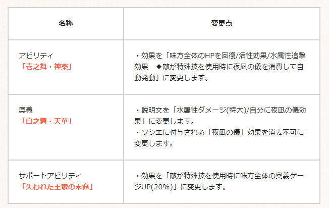 Royal Blood > Descendant of Lost Loyalty (Support Skill) - เปลี่ยนผลเป็นเพิ่มหลอดโอกิ 20% ให้ทั้งทีมเมื่อศัตรูใช้ท่าพิเศษ